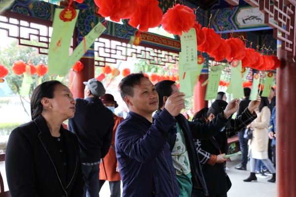 在太液湖公园,大型猜灯谜活动激起了广大市民的参与热情,活动现场,数百条红纸制成的谜语悬挂在半空中,内容丰富多彩,包含了字谜、成语谜、地名谜、人名谜等多种类型。前来猜灯谜的群众三五成群,他们相互交流讨论,时而冥思苦想,时而喜笑开颜,不时有猜中灯谜者前去领取奖品。整个活动过程中,大家积极踊跃参与,气氛热烈而又融洽。