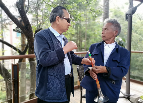 在观景台,大家一起现场学习了扫码使用望远镜观景,走玻璃栈道亲身感受十万大山尽收眼底的美景。78岁高龄的张定华老干部还即兴作诗《游棠梨凹苗寨》,“草田盛装迎远客,棠梨繁华满园香。飘荡轻盈舞苗女,环佩银圈响叮。危危楼道通观景,万山尽翠播绿浪。芦笙高奏歌盛世,游客流连不思乡。”离开观景台,一行人又来到棠梨凹苗寨民宿农家,聆听唢呐民间老艺术家的现场吹奏,老艺术家激动地说:“我们一定会继续吹奏唢呐,传承好中国文化,让世界听见悠扬的唢呐声。”