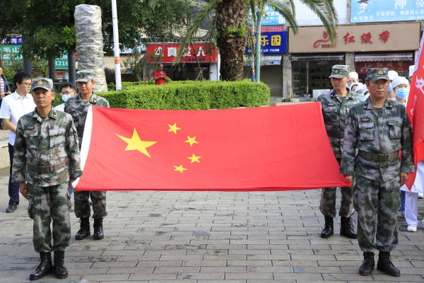 9点整,升旗仪式正式开始。预备役官兵动作整齐划一,迈着铿锵有力的步伐护送国旗行进至升旗台。