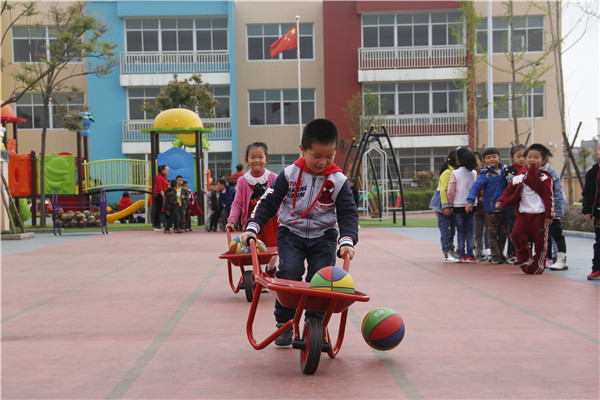 为进一步激发幼儿锻炼的兴趣,跑道区摆放幼儿专用的平衡踏板车、红色小推车、幼儿出租车、双人出租车、三轮车、篮球架等器械,遵循健康领域中幼儿上肢、下肢协调发展的规律,让孩子训练投掷、蹬腿等动作,让孩子们在不知不觉的比赛中得到锻炼并获得自信。