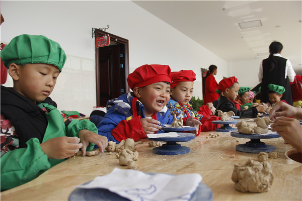 陶艺课上,孩子们正专心致志地制作各种小动物。通过开展陶艺课能锻炼幼儿的小肌肉,而且通过揉搓、摔打泥团使幼儿的体力及身体机能得到锻炼,树立孩子的自信心和成就感,锻炼对事物的控制力。更重要的是,通过玩泥巴培养孩子们的观察能力和创造能力。美工课将孩子的成果进行集中展示,这样有助于激发孩子们的成就感,让孩子们格外珍惜自己的劳动成果。
