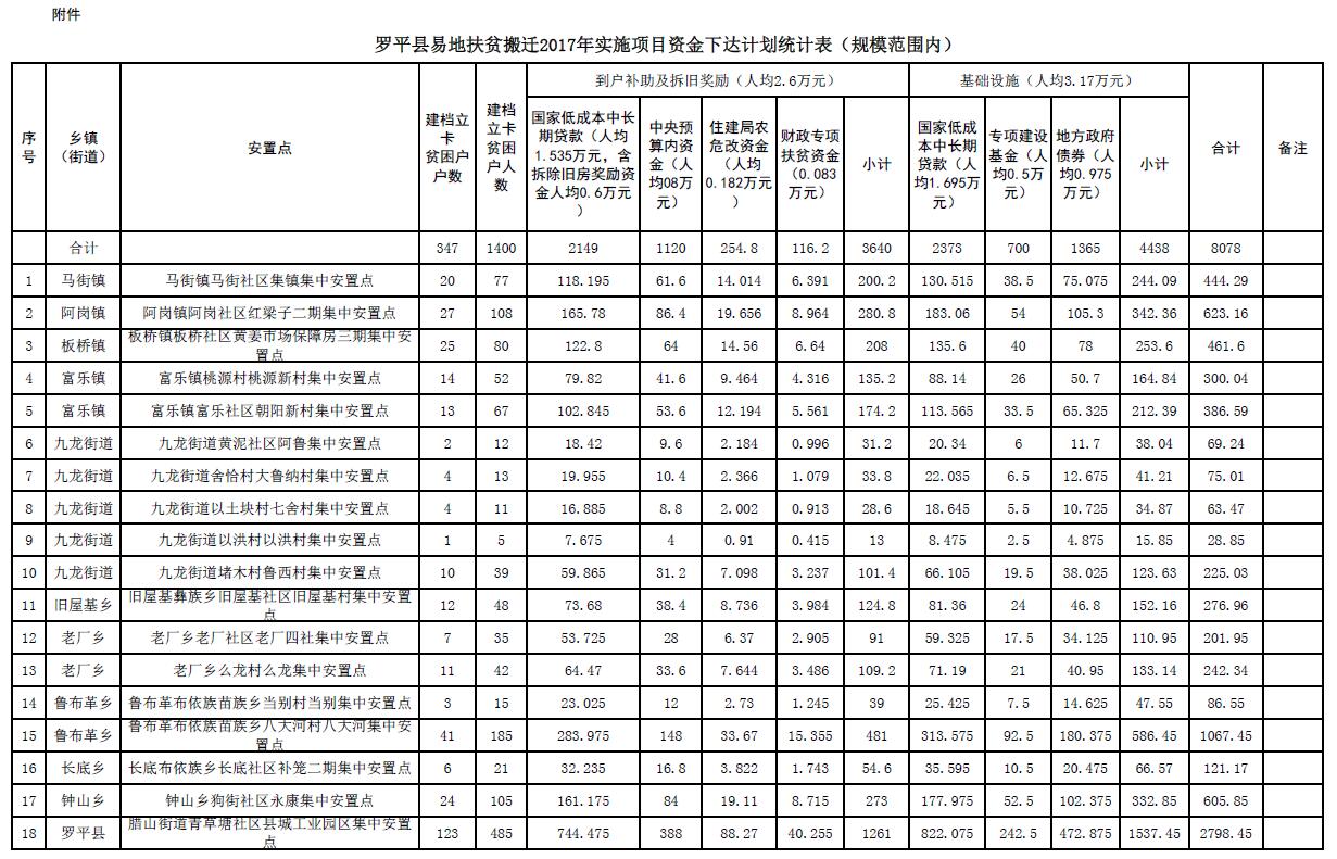 附:罗平县易地扶贫搬迁2017 年实施项目资金下达计划统计表