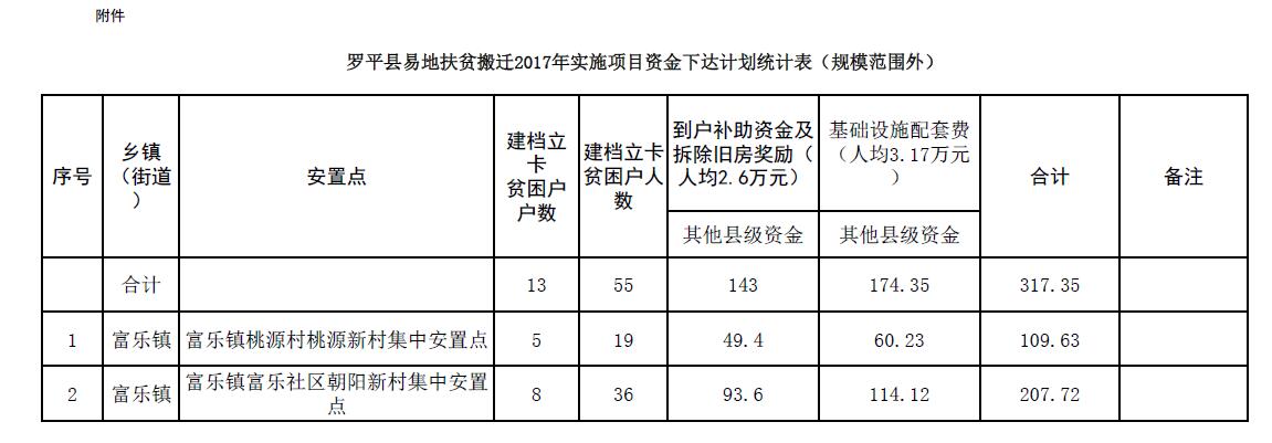 根据《中共罗平县委办公室罗平县人民政府办公室关于印发< 罗平县易地扶贫搬迁三年行动计划>的通知》(罗办发[2015]67 号)文件精神。现将罗平县2017 年易地扶贫搬迁项目资金下达给你们,并就有关事项通知如下: