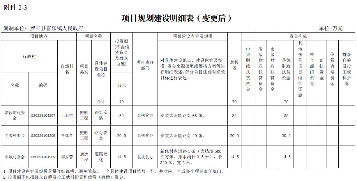 (一)将上石拉村路灯安装资金17万元和上石拉村通村道路资金18万元合计35万元变更为上石拉村68盏路灯安装。