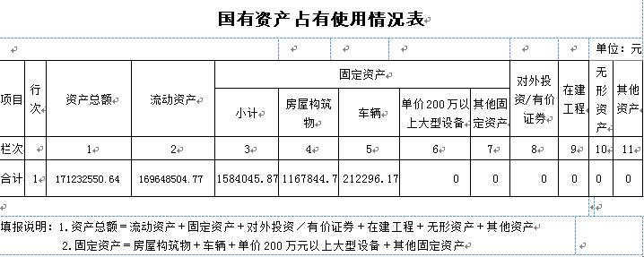 截至2017年12月31日,罗平县招商合作局资产总额171232550.64元,其中,流动资产169648504.77元,固定资产1584045.87元,对外投资及有价证券0元,在建工程0元,无形资产0元,其他资产0元。与上年相比,本年资产总额减少54304216.41元,其中固定资产增加48820元。处置房屋建筑物0平方米;处置车辆0辆;报废报损资产0项,实现资产处置收入0万元;出租房屋0平方米,实现资产使用收入0元。