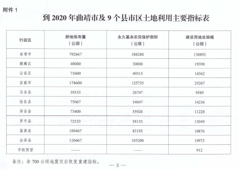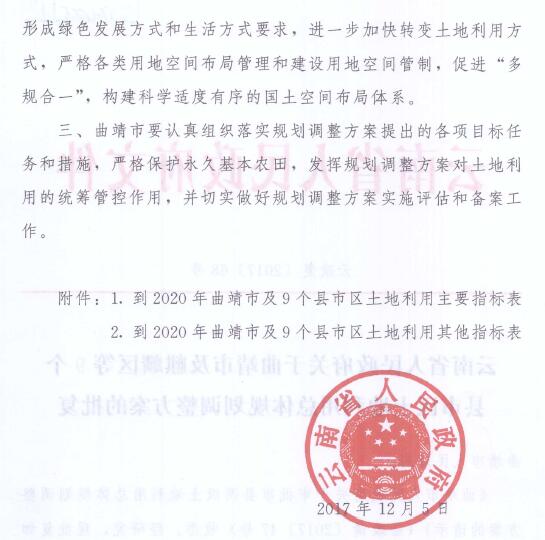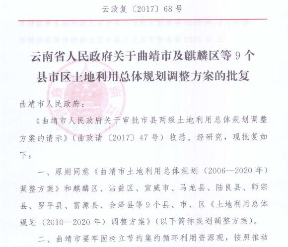 云南省人民政府关于曲靖市及麒麟区等9个县市区土地利用总体规划调整方案的批复