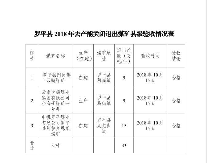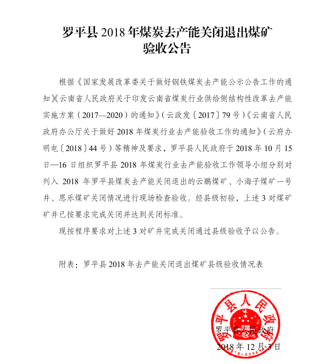 罗平县2018年煤炭去产能关闭退出煤矿验收公告
