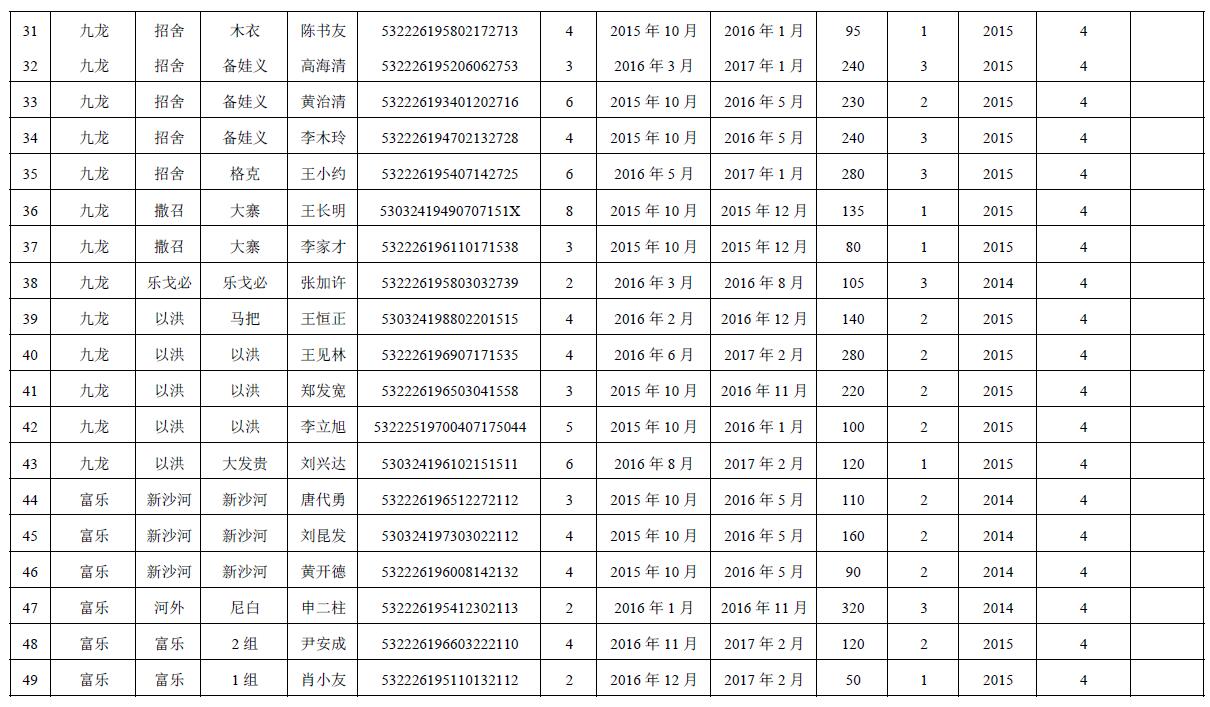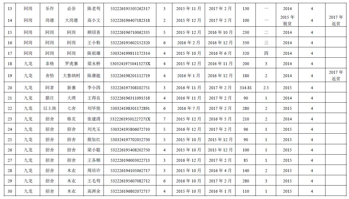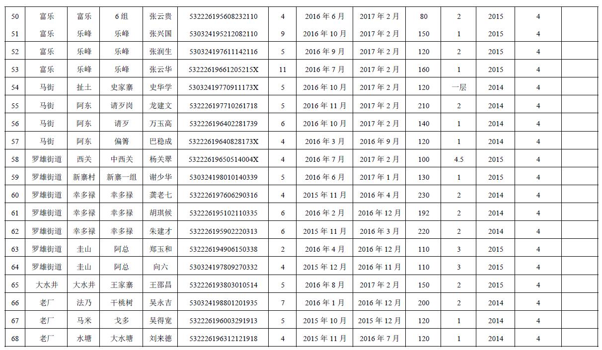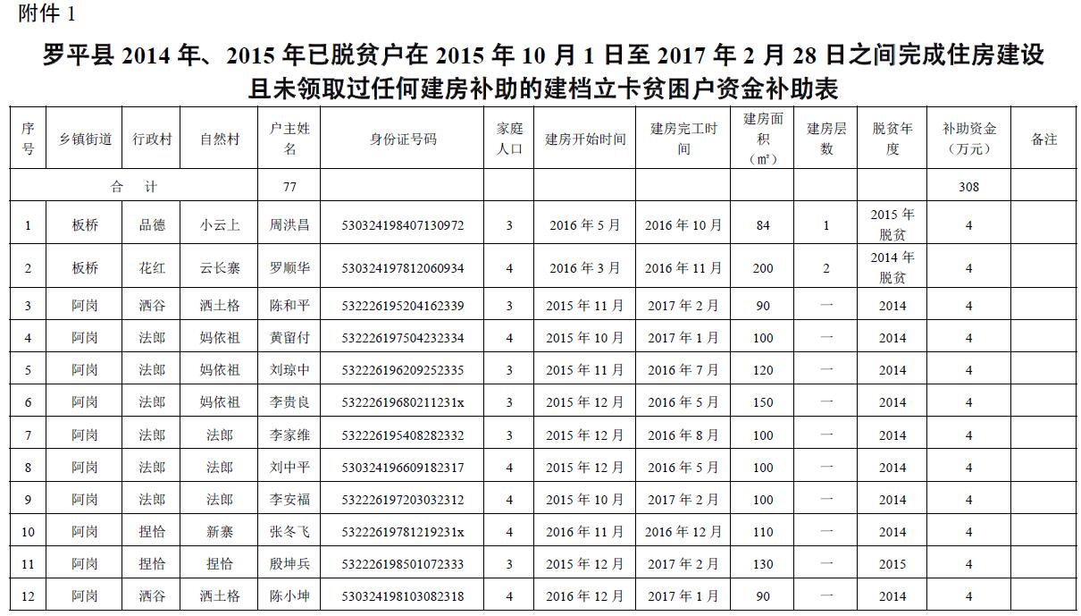 附件:1.罗平县2014 年、2015 年已脱贫户在2015 年10 月1 日至2017 年2 月28 日之间完成住房建设且未领取过任何建房补助的建档立卡贫困户资金补助表