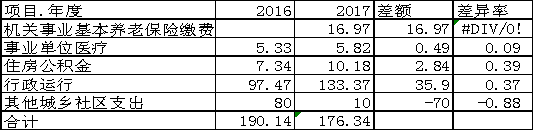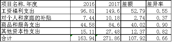 较2016年度相比:工资福利支出增加527,826元,增幅37%,原因是2017年调整工资,工资增加;商品服务支出增加6967元,增幅12%;对个人和家庭的补助增加27404元,增幅37%,主要原因职工工资增加公积金扣缴基数比上年增加。