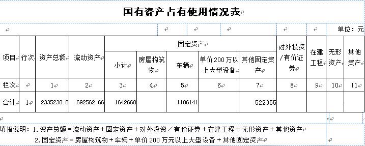 截至2017年12月31日,政协部门资产总额2335230.66元,其中,流动资产692562.66元,固定资产1642668元,对外投资及有价证券0万元,在建工程0万元,无形资产0万元,其他资产0万元(具体内容详见附表)。与上年相比,本年资产总额增加13815.86元,其中固定资产增加13815.56元。处置房屋建筑物0平方米,账面原值0万元;处置车辆0辆,账面原值0万元;报废报损资产0项,账面原值0万元,实现资产处置收入0万元;出租房屋0平方米,账面原值0万元,实现资产使用收入0万元。