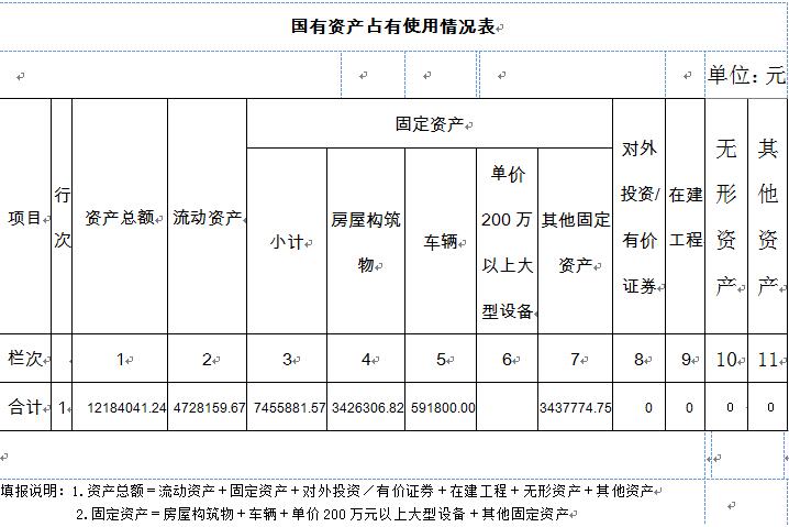 截至2017年12月31日,罗平县水务局资产总额12,184,041.24元,其中,流动资产4,728,159.67元,固定资产7,455,881.57元,对外投资及有价证券0元,在建工程0元,无形资产0元,其他资产0元(具体内容详见附表)。与上年相比,本年资产总额减少 3,683,036.14 元,其中固定资产减少1,079,874.00 元。处置房屋建筑物0平方米,账面原值3,426,306.82元;处置车辆3辆,账面原值880,492.00 元;报废报损资产3项,账面原值349,471.00元,实现资产处置收入0元;出租房屋0平方米,账面原值0元,实现资产使用收入0元。