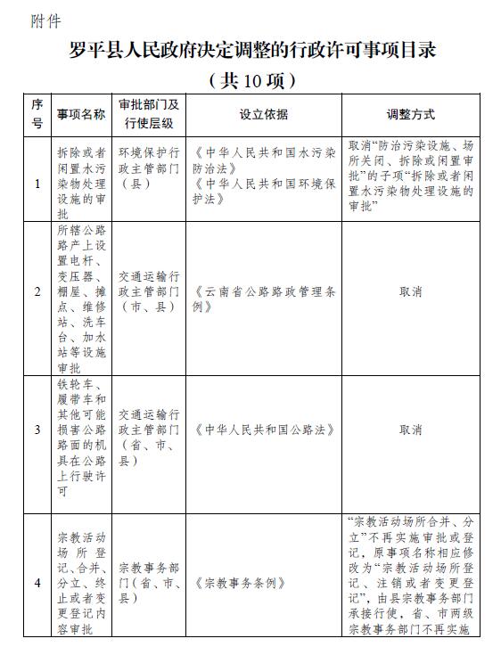 附件:罗平县人民政府决定调整的行政许可事项目录(共10 项)