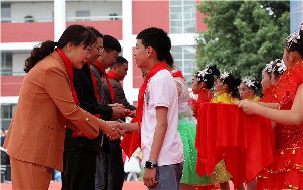 副县长王冬梅、卢恒及县教育体育局、罗雄街道等领导在现场观看演出,并为获得“新时代好少年”、优秀少先队员、三好学生和优秀班干部、进步生、德优生称号学生及书画比赛获奖代表颁发了奖状。学校老师向全体学生表达了诚挚的节日祝福,优秀少先队员们庄重地为观看演出的领导嘉宾们佩戴了红领巾。