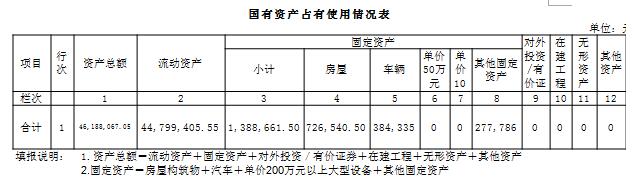 截至2018年12月31日,曲靖市罗平县移民开发局部门资产总额4,618.81万元,其中,流动资产4,479.94万元,固定资产138.87万元,对外投资及有价证券0万元,在建工程0万元,无形资产0万元,其他资产0万元(具体内容详见附表)。与上年相比,本年资产总额增加651.88万元,其中;流动资产增加654.88万元,固定资产减少3.01万元,对外投资及有价证券增加0万元,在建工程增加0万元,无形资产增加0万元,其他资产增加0万元。处置房屋建筑物0平方米,账面原值0元;处置车辆0辆,账面原值0万元;报废报损资产0项,账面原值0万元,实现资产处置收入0万元;出租房屋0平方米,账面原值0万元,实现资产使用收入0万元。