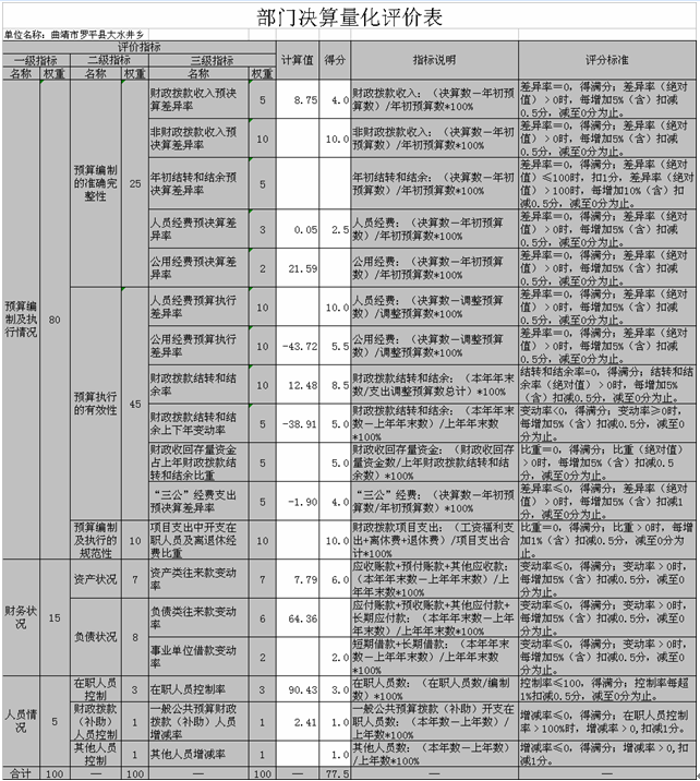 其中:1、预算编制的准确完整性。总分25分,扣8分,扣分依据是年初预算数与决算数差异过在,原因是年初预算只含人员经费和基本的年初人员计算的公用经费,在执行过程中有调整增加的项目经费、调整增资的人员经费;