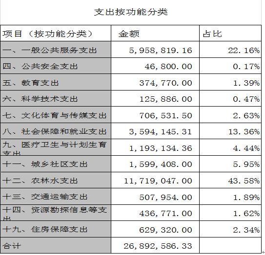 1.一般公共服务(类)支出595.88万元,占一般公共预算财政拨款总支出的22.16%。主要用于人大、政府、财政、纪委、党委等部门的工资支出及公用经费支出及全镇的事业发展经费支出;