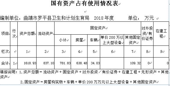 曲靖市罗平县卫生和计划生育局(本级)部门资产总额1,618.93万元,其中,流动资产837.10万元,固定资产781.83万元,对外投资及有价证券0万元,在建工程0万元,无形资产0万元,其他资产0万元(具体内容详见附表)。与上年相比,本年资产总额减少41.04万元,其中;流动资产减少24.26万元,固定资产减少16.78万元,对外投资及有价证券增加0万元,在建工程增加0万元,无形资产增加0万元,其他资产增加0万元。处置房屋建筑物0平方米,账面原值0元;处置车辆0辆,账面原值0万元;报废报损资产70项,账面原值23.17万元,实现资产处置收入0万元;出租房屋0平方米,账面原值0万元,实现资产使用收入0万元。