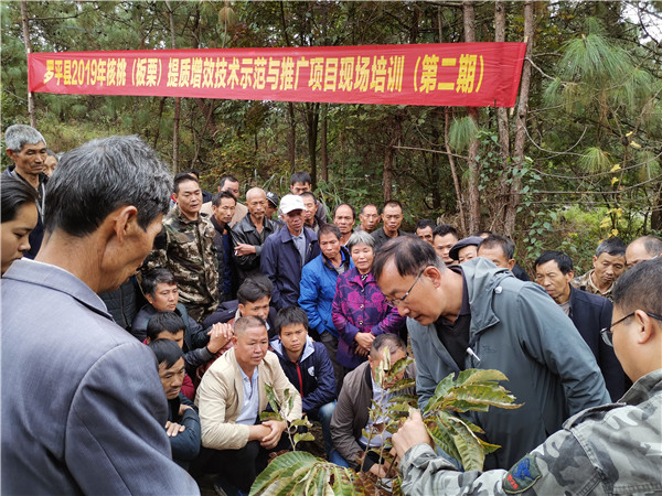 培训班邀请了云南省林业技术推广总站站长施彬对板栗提质增效技术进行授课。施彬向学员们介绍了板栗树的生长特性,对光照、水分、土壤的要求;施彬强调,果园松土、施基肥、喷洒石硫合剂是增强板栗树长势的三个基本环节,是促进增产增收的基础工作;同时以通俗易懂的语言,向参训学员重点讲授了板栗整形修剪、肥水管理、病虫害防治及板栗嫁接技术。参训学员结合实际生产遇到的问题,积极同授课专家互动,一一听取授课专家答疑解惑。