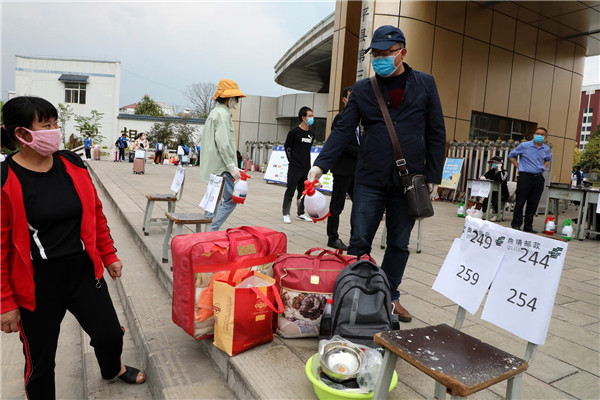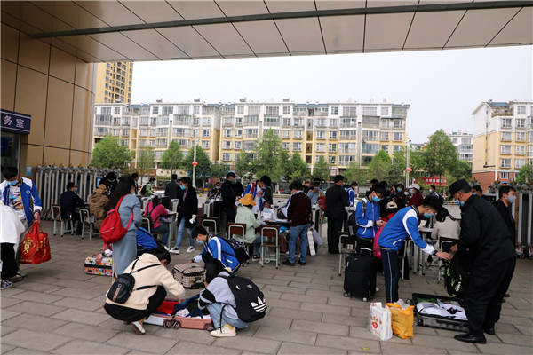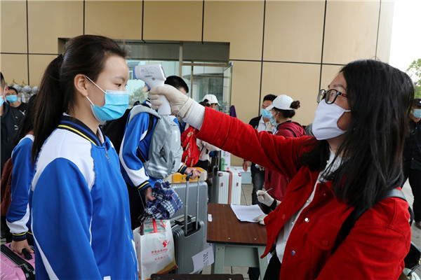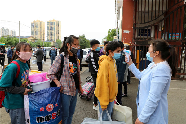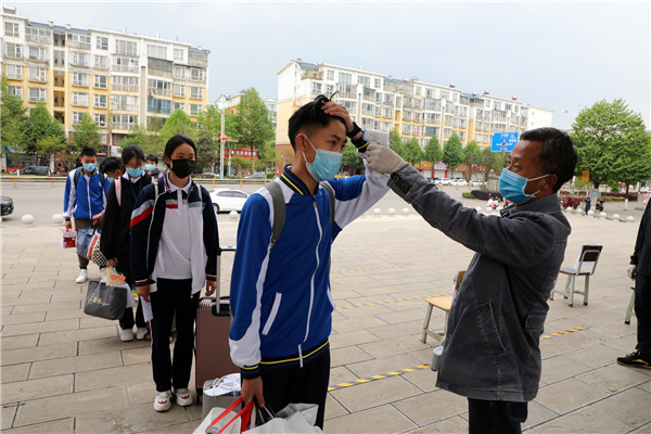 记者来到罗平三中,远远就看到工作人员在指挥车辆停放,学生戴着口罩、拉着行李有序进入消毒区,经过全面消毒后进入报到候检区,学生间必须保持一米以上的距离,班主任早早坐着等候学生前来报到。报到时需上交“返校身体健康登记表”,教师对其体温测量后,填写“体检登记表”,各项指标正常后才能进入校园。同时部分医务人员也加入了检测队伍中,细心周到的为学生做进一步测量体温,为顺利开学保驾护航。“我们宜康医院今天来协助高三学生开学,先由老师用额温枪测量体温,若超37.3摄氏度,我们再用水银温度计复测,如有发热学生,便立即转到医院发热门诊,确保学校安全开学。”罗平宜康医院医生陈芳告诉记者。