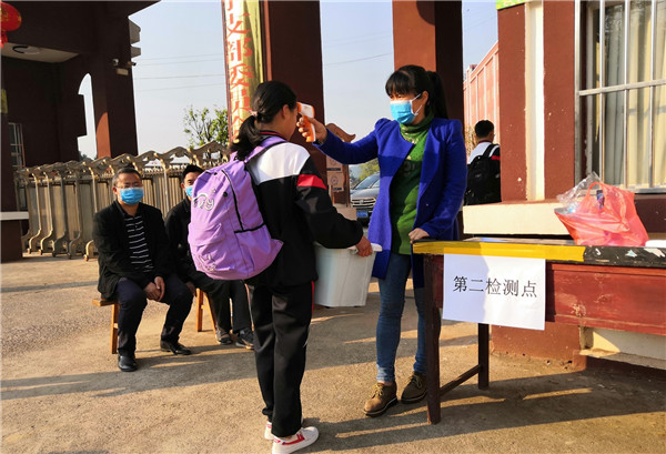 3月23日上午8点始,罗平县马街一中教师忙碌的身影在校园里窜动,同时马街中心卫生院的医务人员和交通管理所的工作人员共同参与了此次特殊的开学工作,共同迎接初三年级迟来42天的开学。