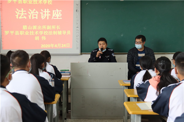 讲座邀请腊山街道派出所副所长、罗平职校法治辅导员胡伟作讲解,通过以案释法,认真分析来自校园内外部影响青少年的安全原因,讲解自我保护的基本方法、技能和要求,讲透中职学生进入营业性歌舞厅、电子游戏厅、吸烟、喝酒、赌博等诱发违法犯罪的场所和因素,强调女生有效地保护自己的方式和方法。