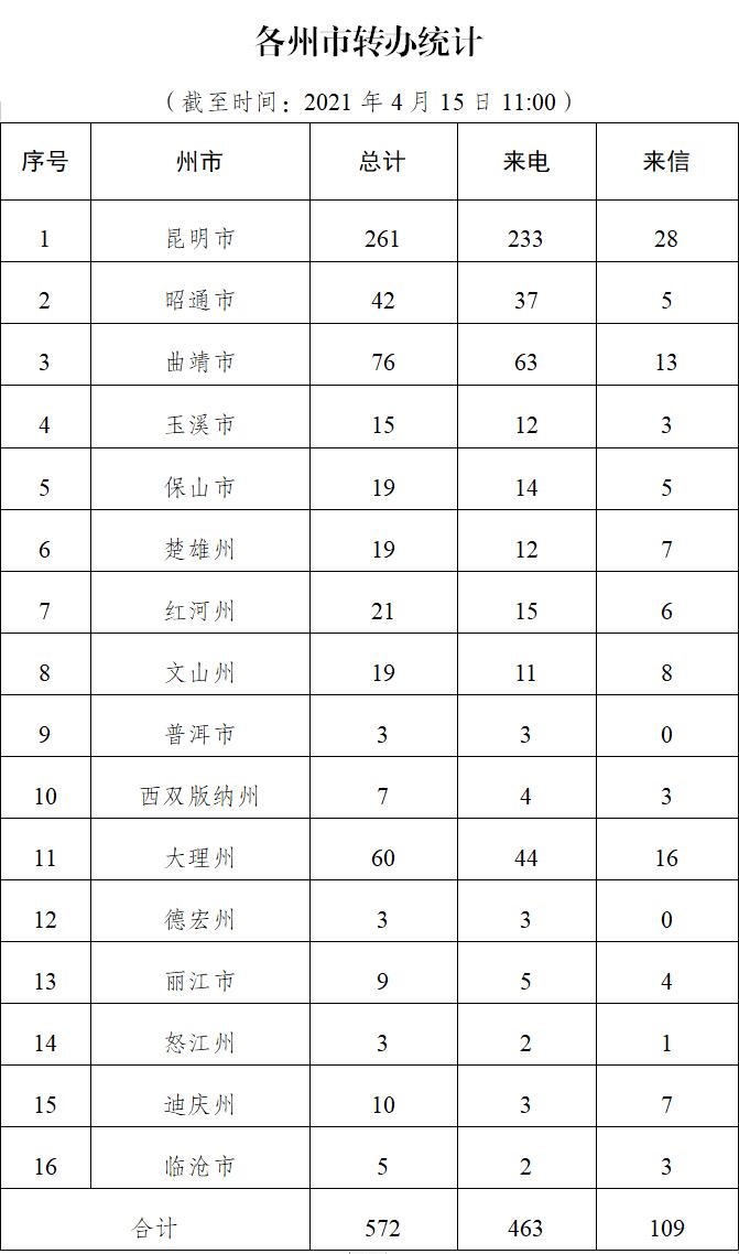 截至4月15日上午11:00,督察组交办群众举报投诉生态环境问题共九批572件(来电463件、来信109件),昆明市261件,曲靖市76件,大理州60件,昭通市42件,红河州21件,楚雄州19件,文山州19件,保山市19件,玉溪市15件,迪庆州10件,丽江市9件,西双版纳州7件,临沧市5件,怒江州3件,普洱市3件、德宏州3件。