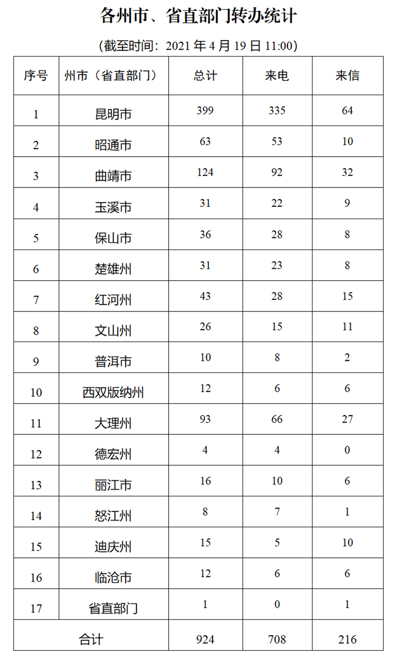 截至4月19日上午11:00,督察组交办群众举报投诉生态环境问题共十三批924件(来电708件、来信216件);其中,昆明市399件,曲靖市124件,大理州93件,昭通市63件,红河州43件,保山市36件,楚雄州31件,玉溪市31件,文山州26件,丽江市16件,迪庆州15件,西双版纳州12件,临沧市12件,普洱市10件,怒江州8件,德宏州4件,省直部门直接办理1件。