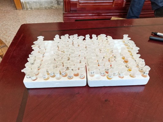 技术人员严格按照操作规程对已免疫的牛、羊、猪、鸡进行实地采血,并认真做好采样登记等工作,确保记录真实、准确、可追溯。此次采样采取随机抽取的方式,共采集牛抗体血样6份,猪抗体血样10头份,羊抗体血样10头份,鸡抗体血样40羽份,共计66份抗体血样,对所采血样及时进行血清分离,送县动物疫病预防控制中心实验室进行羊小反刍兽疫、猪蓝耳病、高致病性禽流感、牲畜口蹄疫等血清学免疫抗体水平检测。