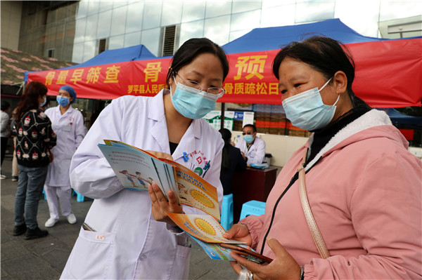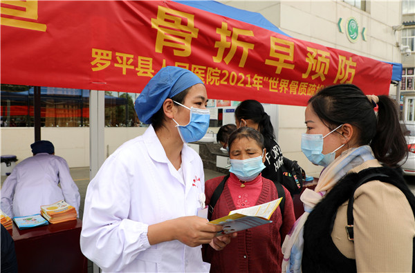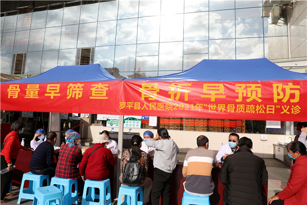 为进一步加强骨质疏松的宣传教育,10月20日,在2021年“世界骨质疏松日”当日,罗平县人民医院开展以“骨量早筛查,骨折早预防”为主题的义诊宣传活动,让广大群众及早认识到骨质疏松的普遍性和危害性,做到早预防、早诊断、早治疗。