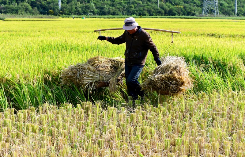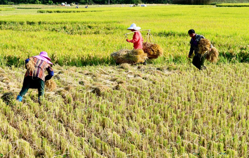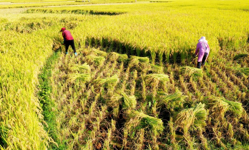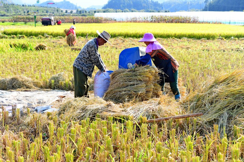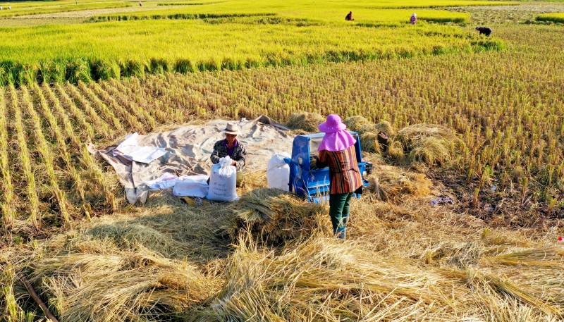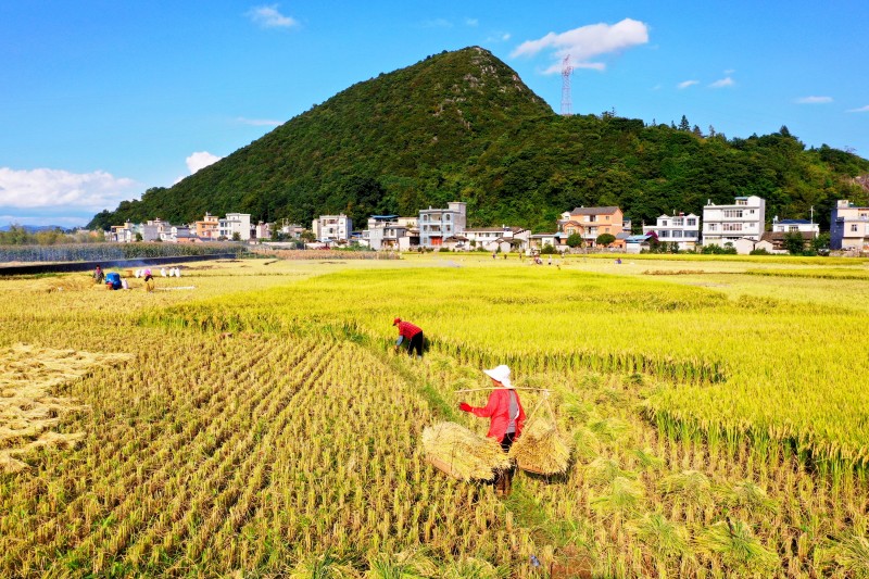 时下,罗平县的10余万亩水稻相继成熟,当地农民正抢抓节令,积极收割水稻,田间地头呈现出一派繁忙的丰收景象。图为9月18日,罗平县九龙街道山后村稻穗飘香,农民们正忙着收割水稻。