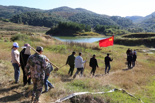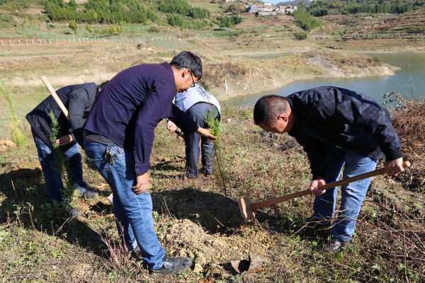 下午3:00来到植树地,大家三三两两结队为伍,挖坑、铲土、扶树苗、夯泥土,各尽其责,干劲十足。经过两小时的辛勤耕耘,在库区周围,种植了1000多棵柏树。