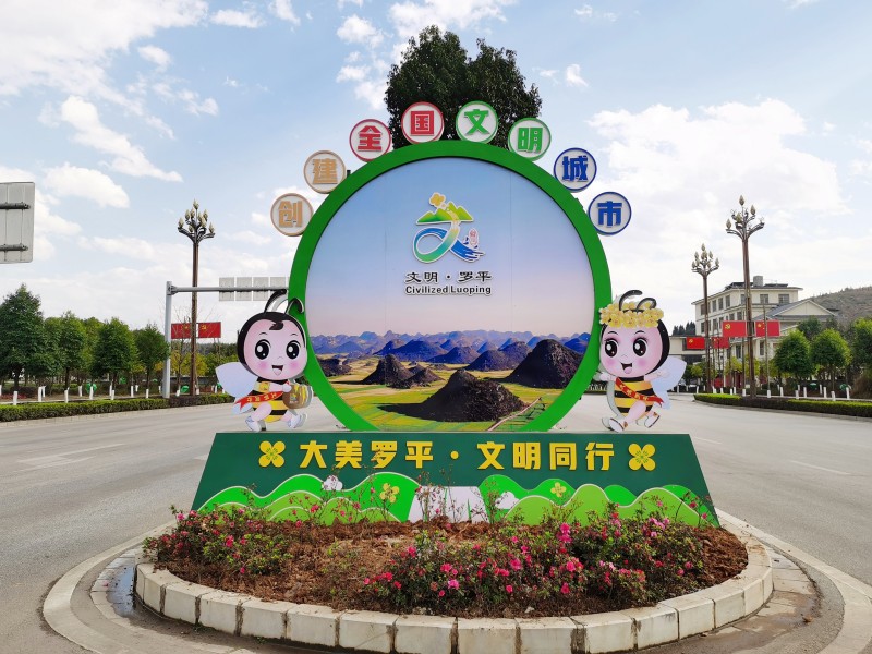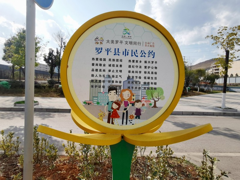 步入九龙大道,面貌焕然一新,原本靓丽的大道又植入创文元素。围绕“大美罗平”主题,用九龙瀑布、多依河、小三峡、金鸡峰丛、古生物化石群等罗平的享誉盛名的景区景点打造精美的景观小品。在大道两旁的景观带里,用菜花形状的大花草景观牌点缀出别样的风景:内容有弘扬中华优秀传统文化的“仁、义、礼、智、信”,有文明健康、绿色环保的“讲文明铸健康守绿色重环保”,也有“奉献友爱互助进步”的学雷锋志愿服务……此外,还有用中国结打造的灯杆广告牌……呈现浓浓创文氛围。