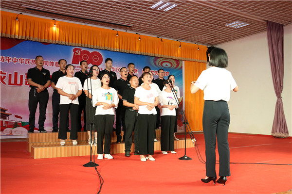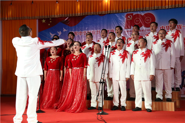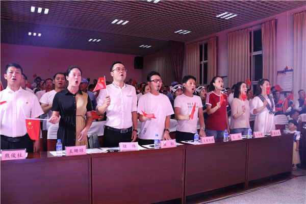 “没有共产党就没有新中国,没有共产党就没有新中国……”晚会尾声,当熟悉的旋律响起,全场人员纷纷起立,挥舞着手中的国旗和党旗,跟随着伴奏高唱《没有共产党就没有新中国》。
