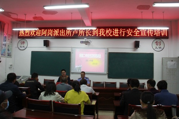 开学后,学校主动与阿岗派出所联系,组织开展了开学安全、法律知识讲座活动。邀请了派出所所长卢华刚为全校教职工进行安全宣传培训,副所长李淋对全校学生开展了安全、法律知识讲座。他们结合实际,以案释法,生动形象地给全校师生上了一堂开学第一课。