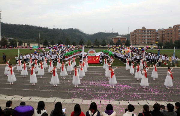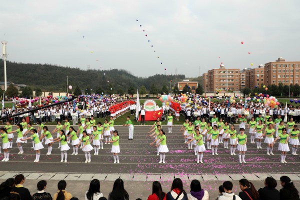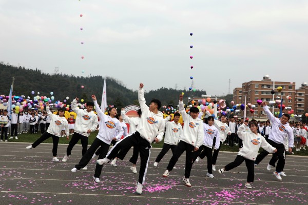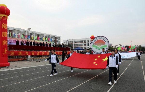走进校园,运动场上人潮涌动,彩旗飘扬,来自全校3500余名师生组成58个方队,包括国旗、校旗、校徽、会徽、彩旗、花环、裁判员及各班级组成的学生方队。他们满怀喜悦心情,精神饱满,伴随着雄壮激越的《运动员进行曲》,以多姿的阵势,百花齐放,尽情舞动,有序步入赛场。他们挺拔的身姿,整齐有力的步伐,多彩的运动元素如花朵般绽放,别具特色。整个开幕式有创意、有特色,独具匠心,用独特的表演迎接本次体育艺术节的到来,展现青春向上的激情和活力。