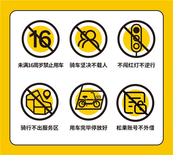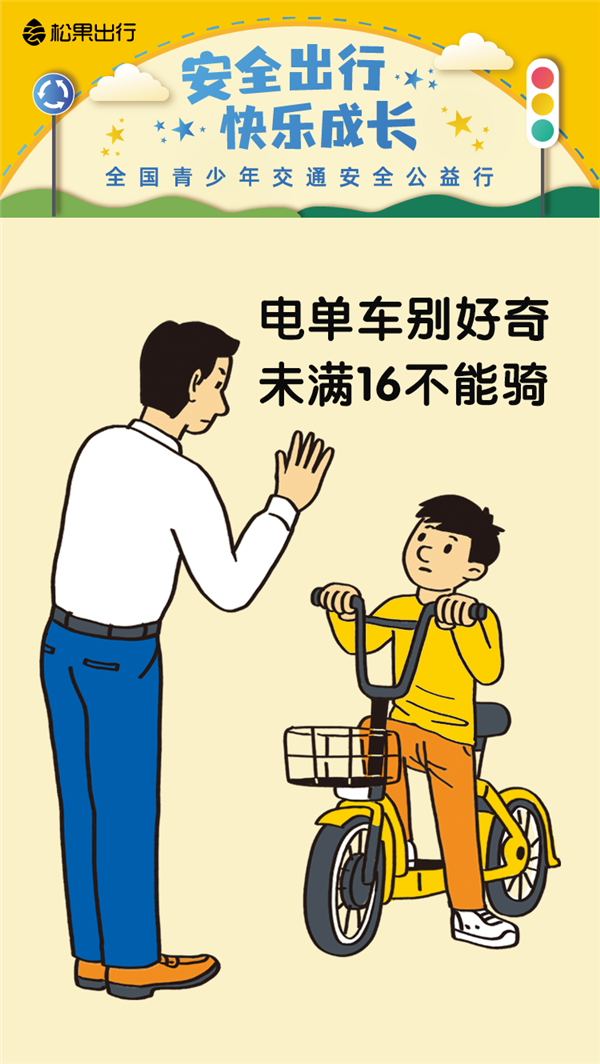 为禁止未成年人骑行,松果电单车在注册环节有严格限制。凡未满16周岁无法注册用车。松果车身也设置明显警示标语:“严禁未满16岁骑行”、“禁止骑车载人”。同时,松果电单车工作人员7*12小时不间断巡街,一旦发现违规骑行现象将会拉入黑名单。据了解,此次活动松果电单车共联合全国200多城市同时开展,旨在教育一个孩子、带动一个家庭、影响整个社会。