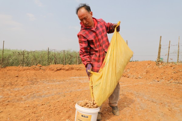 不远处,蔡海波的妻子低着头,沿着新开的沟,种植着一块块色泽鲜黄、肉质饱满的姜种。由于手法熟练,不一会儿,她就种植了数沟小黄姜,紧接着又开始忙着撒肥料,各个种姜环节井然有序,忙而不乱。