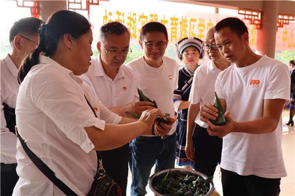 活动当天,雨滴滴答答地下个不停,虽带来丝丝凉意,但丝毫没有减退大家的激情。大家徒步参观了小河边市级民族团结示范村,聆听了全国民族团结进步模范个人熊明华所作的民族团结进步主题宣讲,集体合唱了《没有共产党就没有新中国》《歌唱祖国》《爱我中华》《团结就是力量》等经典红歌,诵读了红色诗歌《永远跟党走》,观看了民族舞蹈,参加了包粽子、舂粑粑等民俗活动,同时还开展了“中华民族一家亲·携手保护母亲河”志愿服务活动及节日慰问活动。