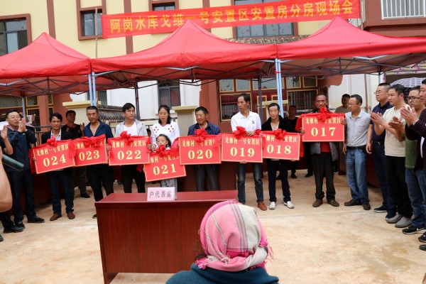 据了解,当日,22户移民全部抽签选房结束,李吉平、阿岗镇党政领导为他们授予房牌,挂红鸣鞭炮,祝愿他们越过越红火。