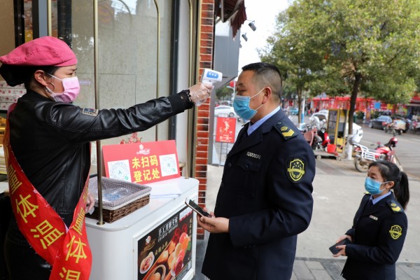 走进大街小巷,在商场、超市、手机店、服装店、餐饮、宾馆酒店等行业场所,随处可见市场监管人员上门监管服务的身影。对清扫消毒、出入扫码、佩戴口罩……进行监督指导。“我们员工早上进来要登记测体温,佩戴口罩,洗手以后才到厨房上岗,专人对场所进行消毒,凡进我们店就餐的客人都要求扫码出入,测体温、戴口罩、手上消毒,若没有戴口罩的,我们就免费提供给他们,并且根据客人的流量进行控制,避免人多聚在一起带来风险,外卖设有专门的取餐点,骑手不进入场所取餐,有效保障食品安全。”常春藤西餐厅负责人陈蕾介绍道。