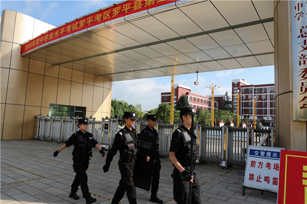 为确保考场秩序和中考安全,公安、特警在考点前加强值守巡逻,严禁无关人员进入。在考点周边部署了多名警力,做好考点周围各路口、路段的交通指挥、疏导工作,对运送考生的车辆进行有序指挥,确保安全畅通。